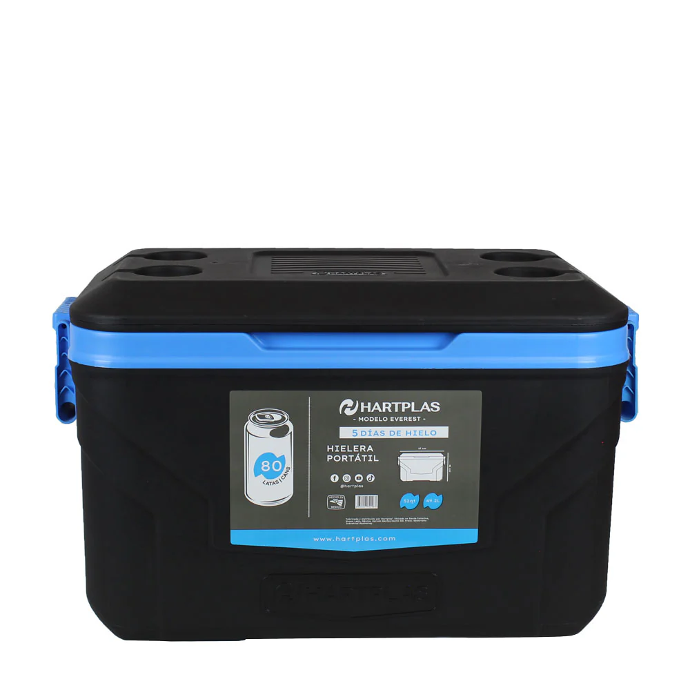 Prepárate para aventuras en el campo junto a tu familia con nuestra hielera portátil de 52 Qt (49.2 litros). Diseñada para brindarte la máxima capacidad de almacenamiento. Es nuestro modelo de hielera más grande. Para que la puedas dimensionar, le caben hasta 80 latas o 5 bolsas de hielo (25 kg). Si llenamos la hielera solamente con hielo y la mantenemos en un lugar fresco, tiene una duración de hielo de hasta 5 días.